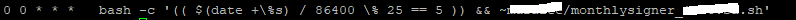 So to use all this in our crons, we need to know the starting date, the frequency (every N days) and calculate the modulo. Once the modulo is known, we run the job if the modulo calculated for “now” (when the job is invoked) matches the modulo we want. So for instance if the period is 13 days and the modulo we want is 6, in our script we do: