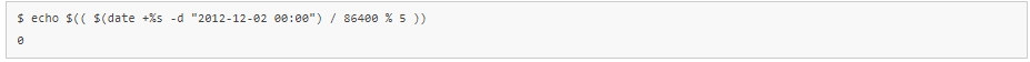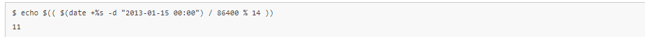 Once we have an actual date of first execution for our task (say, 2013-01-15, a Tuesday, at 00:00), we can divide the time passed since the Epoch until our date into groups of N days. For this first example, let’s say N == 14, two weeks. With the following calculation we can see which place our starting day occupies in a period of 14 days (two weeks):