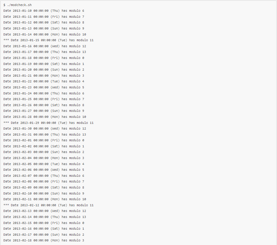 So there we have it, every second Tuesday starting from 2013-01-15. The code shown in modcheck.sh can be made generic so that values can be passed from the command line: