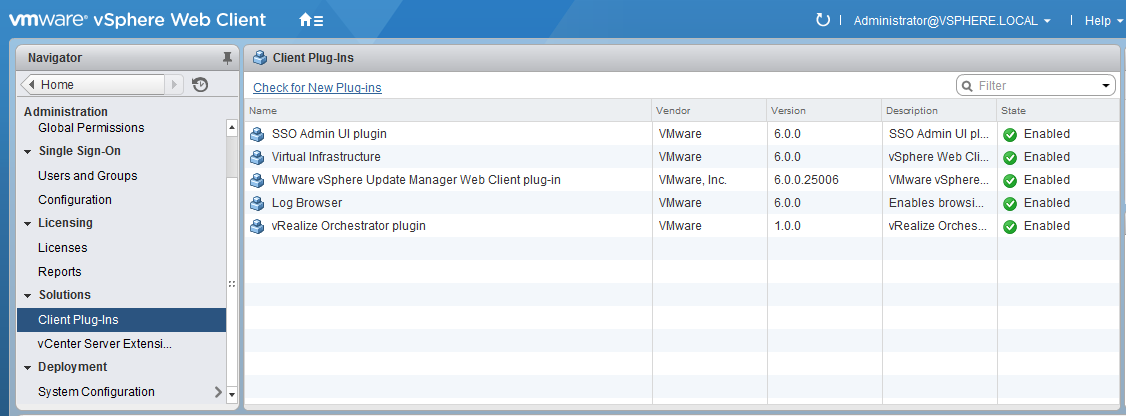 Finally once installed log in to Vsphere Web Client and enable the Vsphere Update Manager Web Client-Plugin via Administration –> Solutions–>Client-Plugiuns(incase the Web Client Plugin is not visible click on “Check for New Plug-ins)