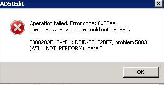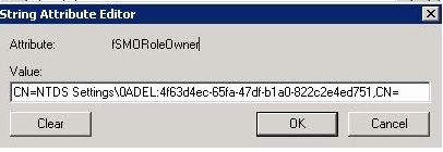 4 On CN=Infrastructure Properties click on fsMORoleOwner attribute and click on edit you will find an incorrect entry as below