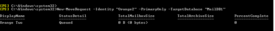 1) Create a new Move Request via Exchange Shell (Orange2 Mailbox has been moved to MailDB1 Database)